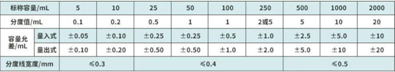 其规格以所能量度的最大容量(mL)表示,常用的有10mL、25mL、50mL、100mL、250mL、500mL、1000mL等。外壁刻度都是以mL为单位,10mL量筒每小格表示0.2mL,而50mL量筒每小格表示1mL。可见量筒越大,管径越粗,其精确度越小,由视线的偏差所造成的读数误差也越大。所以,实验中应根据所取溶液的体积,尽量选用能一次量取的最小规格的量筒。