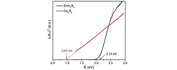 需要注意的是,读取的UV谱图纵坐标应为吸收值Abs,如果是透过率T%,可以通过公式Abs=-lg(T%)进行换算。在origin中以(αhv)1/n对hv作图,如下图所示ZnIn2S4为直接带隙半导体,n取1/2,将所得到图形中的直线部分外推至横坐标轴,交点即为禁带宽度值。