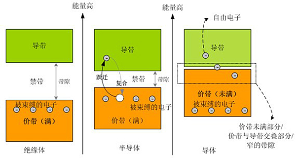 一般常见的金属材料,因为其传导带与价带之间的“能隙”非常小,在室温下电子很容易获得能量而跳跃至传导带而导电,而绝缘材料则因为能隙很大(通常大于9电子伏特),电子很难跳跃至传导带,所以无法导电。一般半导体材料的能隙约为1-3电子伏特,介于导体和绝缘体之间。因此只要给予适当条件的能量激发,或是改变其能隙之间距,此材料就能导电。