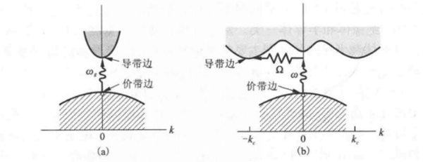 下图(a)显示的跃迁中,电子的波矢可以看作是不变的,对应电子跃迁发生在导带底和价带顶在k空间相同点的情况,导带底和价带顶处于k空间相同点的半导体通常被称为直接带隙半导体。