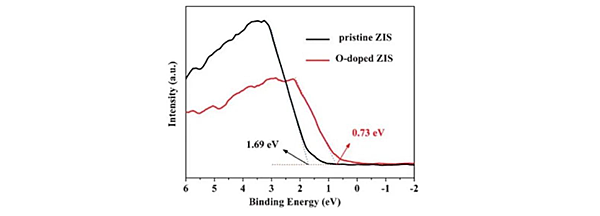 如下图,根据ZnIn2S4以及O掺杂ZnIn2S4的VB XPS图谱,在0 eV附近(2 eV和1 eV)发现有直线部分进行延长,并将小于0 eV的水平部分延长得到的交点即分别为ZnIn2S4以及O掺杂ZnIn2S4的价带位置对应的能量(1.69 eV和0.73 eV)。